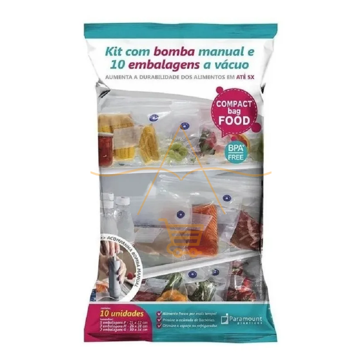 Kit 10 sacos a vácuo compact food + bomba manual - Paramount, Sacos a vácuo para alimentos.