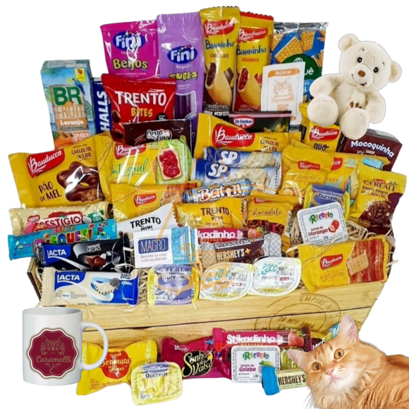 Maravilhosa Cesta para Café da Manhã com 30 itens e Chocolate 22 Itens + Caneca + Chaveiro de Pelúcia!!